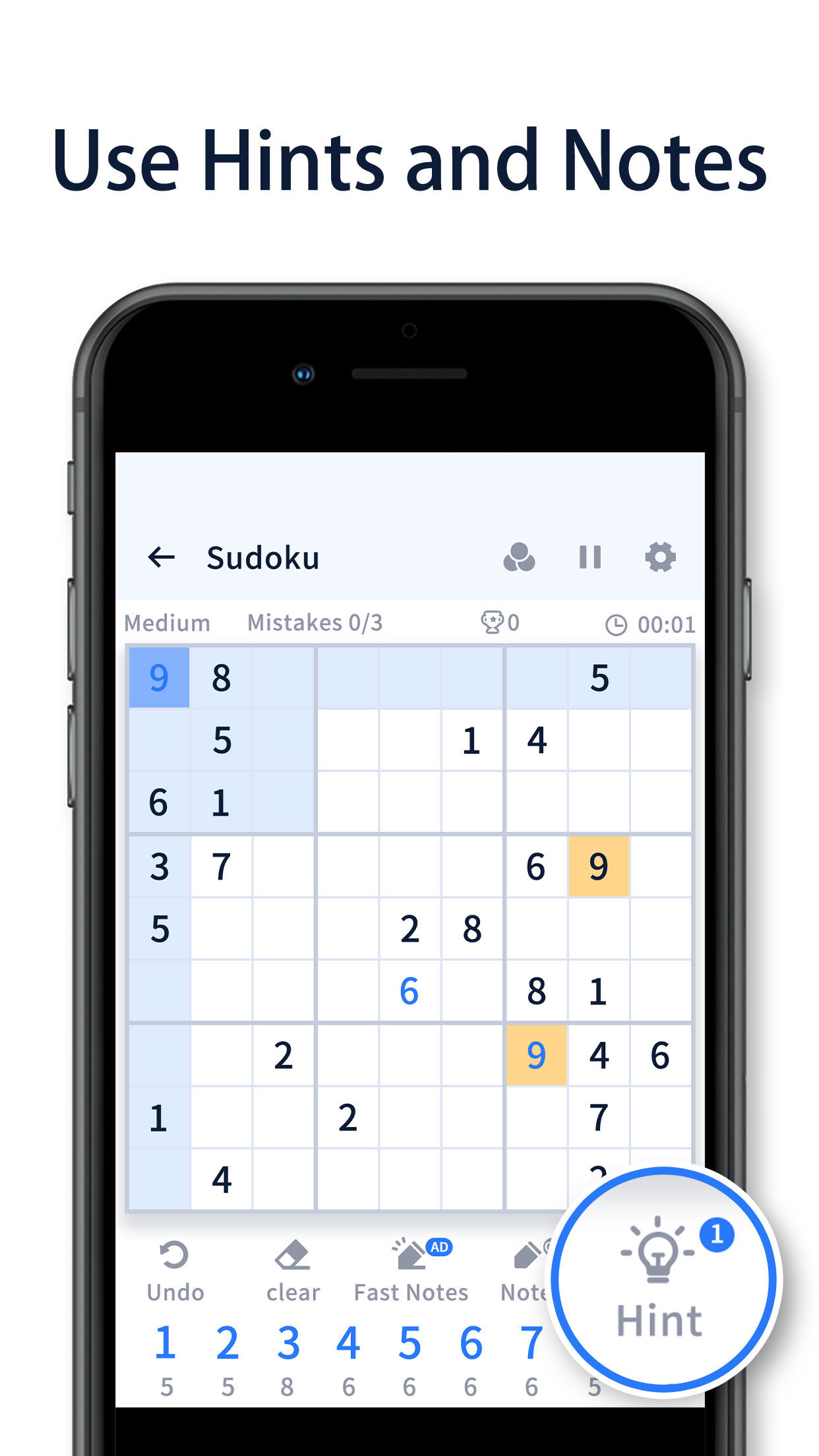 -- Hints. When you get stuck on a difficult puzzle, use the hints and the system will automatically fill in the correct number in the cell you choose to guide you through the difficulty.