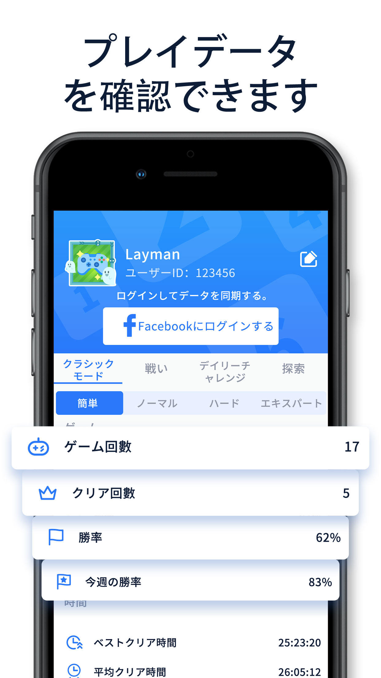 統計情報:ナンプレの難易度ごとに進捗状況、ベストタイムなどの実績を記録