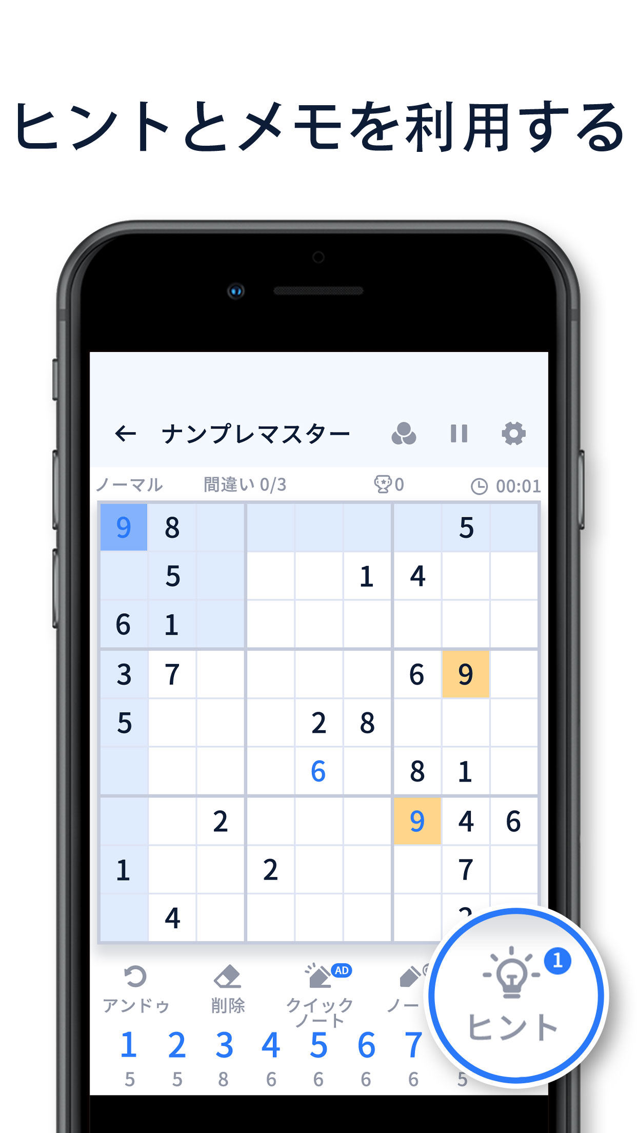 難しいパズルに行き詰まったときは、ヒントを使えば、選んだマスの正しい数字を自動的に埋めて、難易度を減らしてくれます。