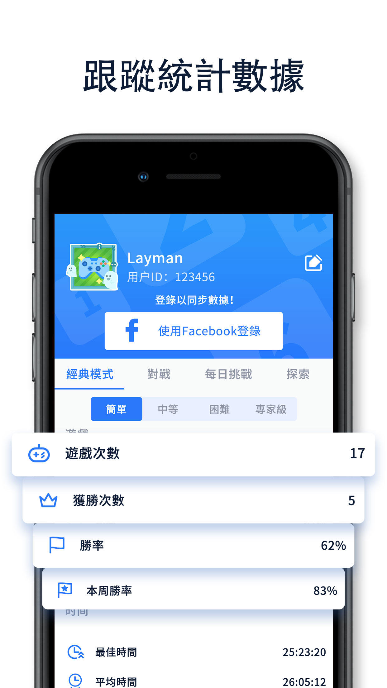 統計資訊:記錄數獨謎題的每個難度等級的進度、最佳時間及其他成就